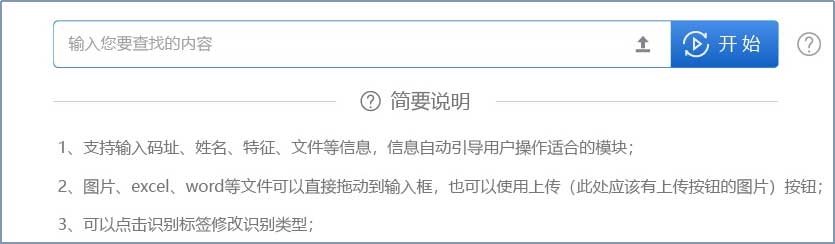 建設統(tǒng)一入口界面,實現(xiàn)用戶的多種輸入方式,包括但不限于各類碼址、名稱、地址、特征片段、數(shù)據(jù)文件、文檔文件等。支持通配符方式;支持中英文兩個語種的輸入支持和判斷,支持中英文混合輸入;支持多條信息或文件的輸入。
